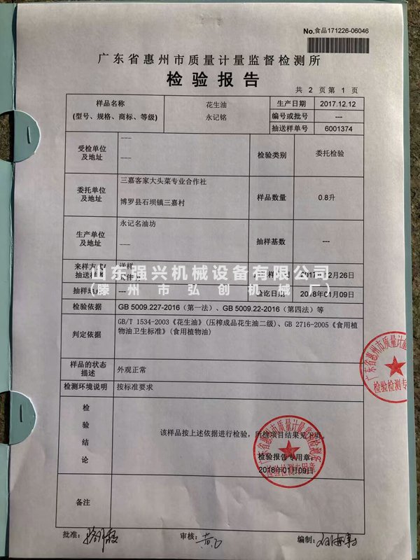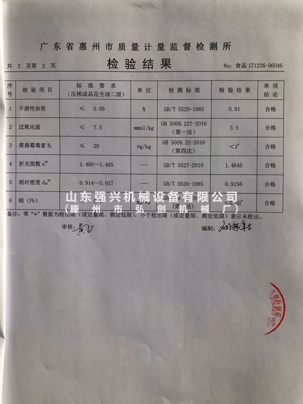廣東惠州顧客使用我公司生產(chǎn)的榨油設(shè)備壓榨出的花生油,經(jīng)過(guò)政府質(zhì)量檢測(cè)機(jī)關(guān)的檢測(cè)達(dá)到花生油二級(jí)標(biāo)準(zhǔn)。